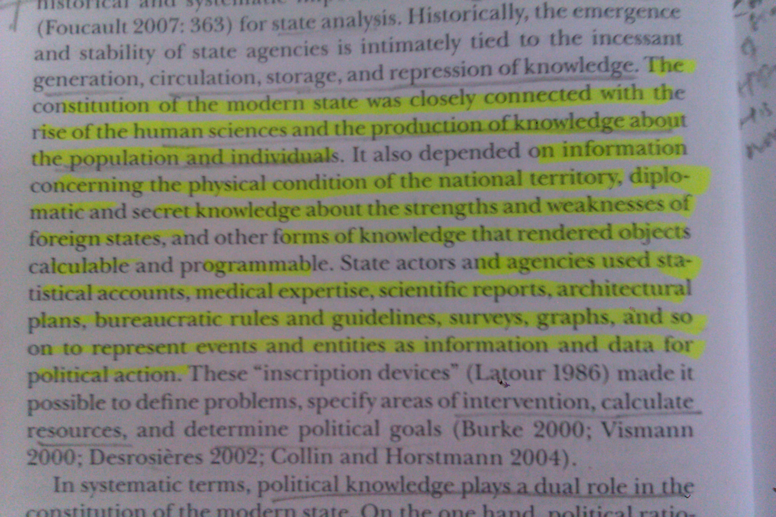 It’s only been out a couple of years, but the copy of Thomas Lemke’s 2012 book in the JNU library is already well-thumbed and annotated. In the chapter ‘Genealogy of the Modern State’, Lemke outlines Foucault’s work on the relationships between power and knowledge and the rise of modern forms of state-based governance. The role of technologies and information in this process is central to constituting a field of intervention. Consequently they are ‘performative’ in the sense of generating the objects that they name. Technologies are understood as both material and ‘spiritual’ (‘the soul is the prison of the body’) with Latour and Callon’s work cited on objects and practices as ‘translating’ relationships (between individuals, groups, areas, etc) into other forms. Lemke reads Foucault as suggesting (in line with Latour) that these translations can sometimes be hard to reverse. Once a river is dammed, a road built, or a religion spread, it can be hard to undo. This is a handy critical overview to Foucault’s work on governmentality and the body of commentary and adoption that has grown in it’s wake. It’s concise (200 pages maybe) but still opens up debates and connects between texts deftly. I wish I had read it when I was drafting my proposal!