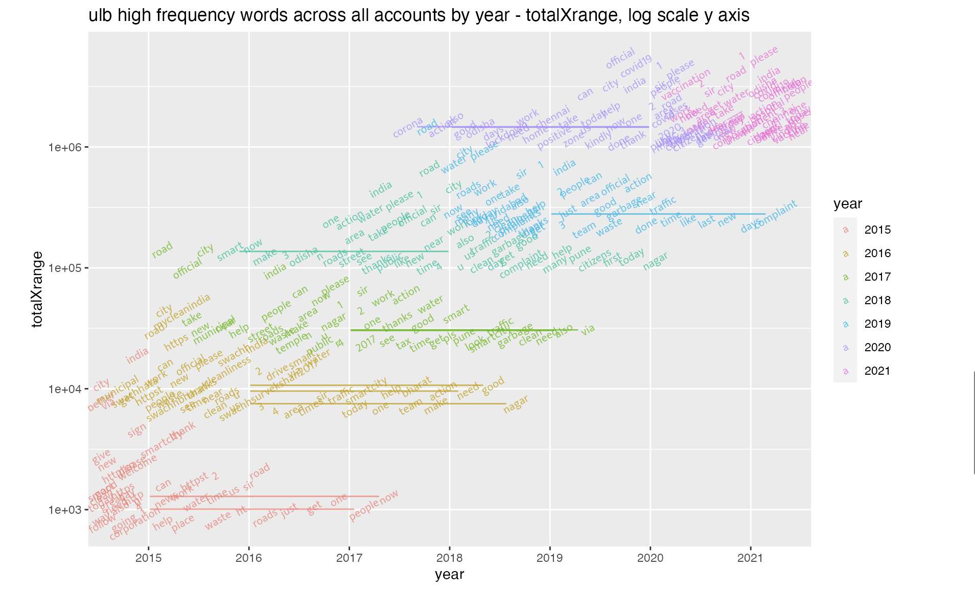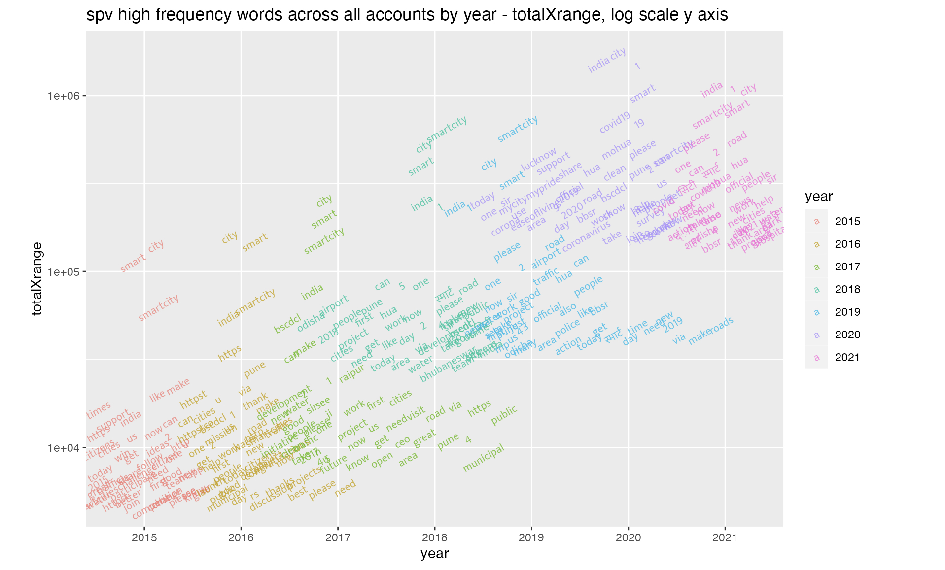 Using 4.3 million tweets that mentioned smart city accounts, we extracted the most common words used over time. The plots below show the frequency of use multiplied by the number of accounts mentioned. The local government (ULB) and smart city parastatal accounts (SPV) are treated separately. What do you notice?